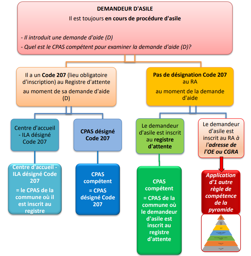 Lorsqu’aucun CPAS ni structure d’accueil pour demandeurs d’asile n’a été désigné comme lieu obligatoire d'inscription (en code 207) pour le demandeur d’asile, c’est le CPAS de la commune où l’intéressé est inscrit au registre d’attente qui est compétent pour accorder l’aide sociale (aide sociale financière, premier loyer, etc.)