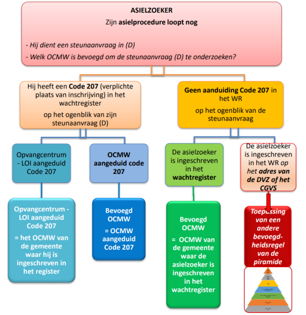 Wanneer geen enkel OCMW of opvangstructuur voor asielzoekers werd aangeduid als verplichte inschrijvingsplaats (in code 207) voor de asielzoeker, is het OCMW van de gemeente waar de betrokkene is ingeschreven in het wachtregister bevoegd om de steun toe te kennen (financiële maatschappelijke hulp, eerste huur, enz.).
